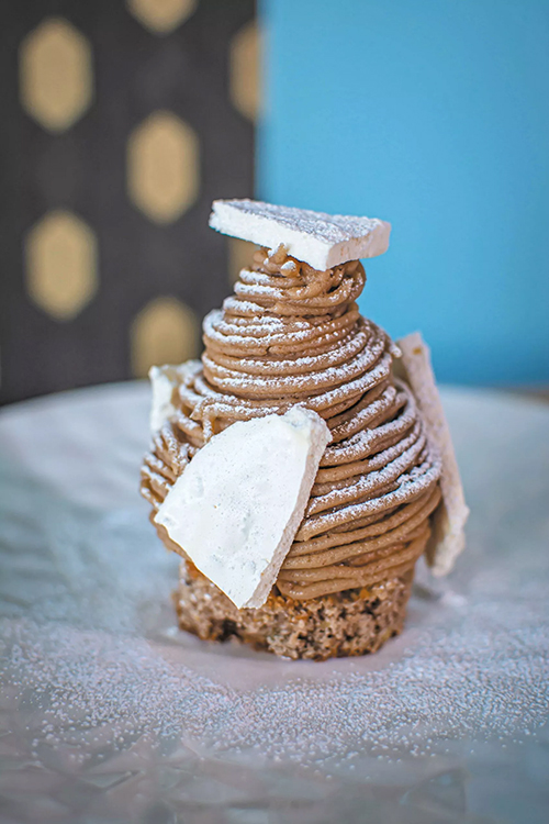 Mélangez dans un batteur les 100 g de mascarpone, 500 g de crème et 25 g de sucre en poudre. Grattez 1 gousse de vanille et laissez monter jusqu’à obtention d’une chantilly bien lisse. Pochez la chantilly dans des moules coniques, et mettez un peu de crème de marrons au milieu. Découpez à l’emporte-pièce des cercles de biscuits de la dimension des moules et déposez-les sur la chantilly pour faire un socle, mettez le tout au congélateur 4h minimum.
