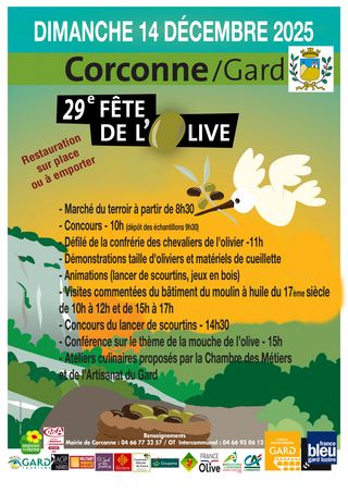 LIREFête de l'olive de Corconne Manifestation incontournable de cette fin d’année, la vingt-neuvième fête de l'olive de Corconne, dans le Gard, aura lieu dimanche 14 décembre 2025 ; cette journée est à la